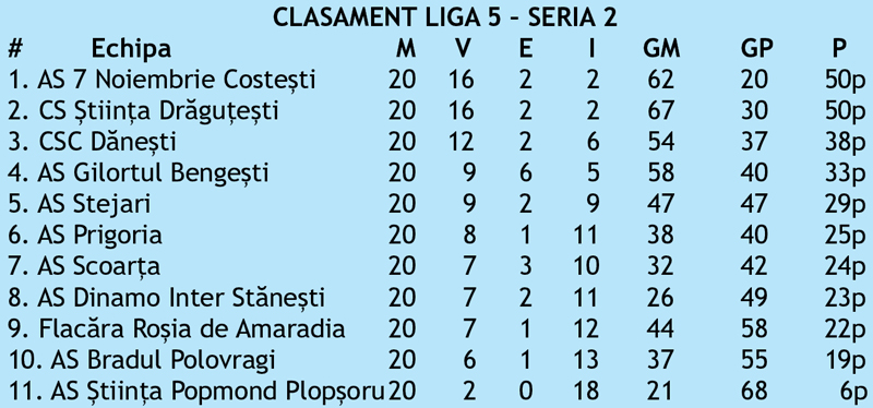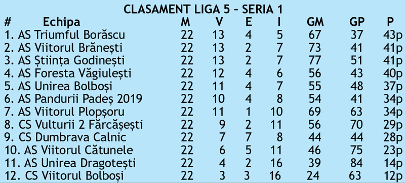 Liga 5 din Gorj și-a consumat în weekend ultimele etape. Triumful Borăscu chiar a triumfat în Seria 1, asta în ciuda eșecului din ultima rundă. Clasamentul a fost strâns pe podium, alte două formații fiind separate doar de golaveraj. În Seria 2, două echipe au terminat în vârful ierarhiei. AS 7 Noiembrie Costești a avut cifre mai bune ca Ştiința Drăguțești, dar echipa lui Cristian Tîlvescu a stat mai bine în meciurile directe. Astfel, oficialii formației din Drăguțești au confirmat că vor evolua în Liga 4 în sezonul următor.