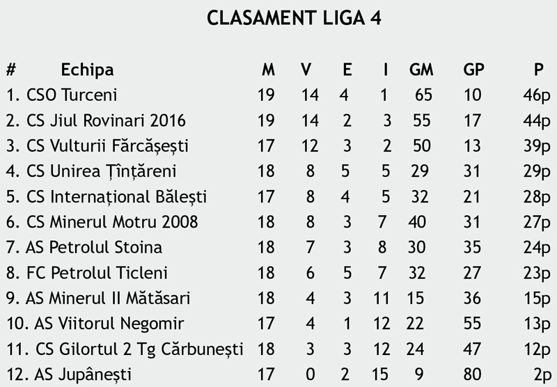 Liga 4 din Gorj se apropie de final, iar lupta la vârful clasamentului rămâne strânsă. Lider este CSO Turceni, care nu a avut emoții în această rundă cu una dintre protagonistele etapei precedente, Petrolul Țicleni. Jiul Rovinari s-a impus, la limită, cu Stoina pe teren propriu, în timp ce Vulturii Fărcășești, ultima formație cu șanse la titlu, are două meciuri restante. În seriile din Liga 5 nu s-au schimbat primele locuri: Energetica Tismana și CSC Dănești.