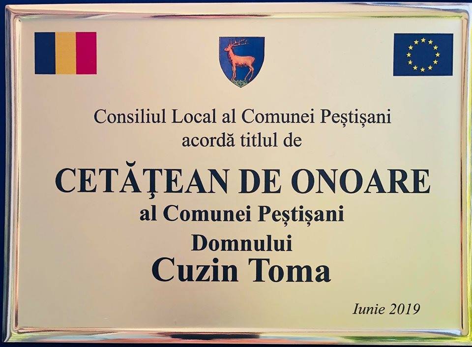 „Pentru viitorul acestei localităţi, împreună cu Consiliul Local Peştişani, am decis să căutăm nişte ambasadori ai comunei care să promoveze aceste minunate meleaguri, şi de aceea am decis să decernăm titlul de cetăţean de onoare Roxanei Croitoru şi lui Toma Cuzin, doi tineri frumoşi care au timp să ne ajute şi să ne promoveze”, a declarat primarul Cosmin Pigui.