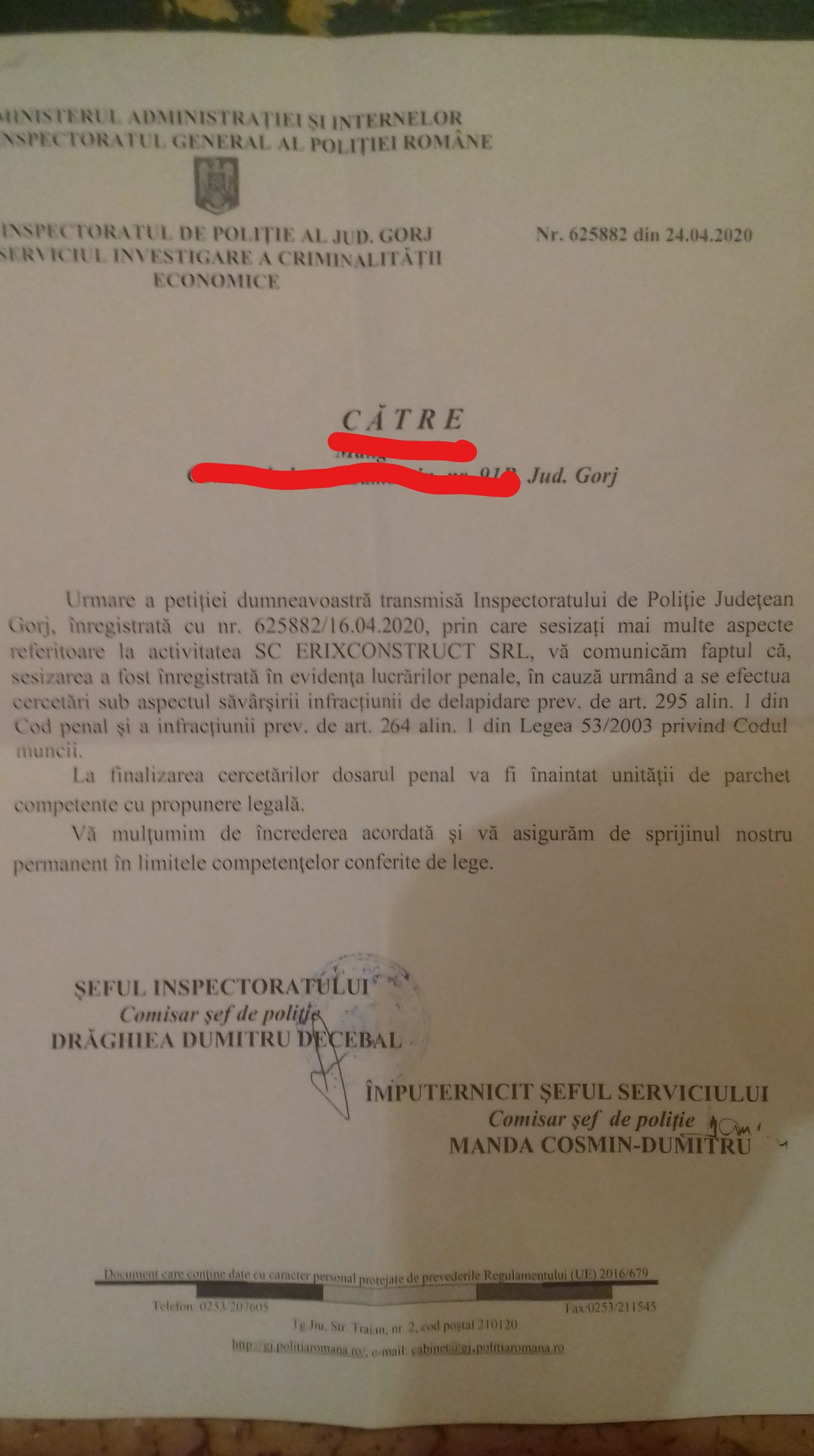 IPJ Gorj a fost sesizată că firma în cauză, cu sediul în Târgu-Jiu, ar trage în piept salariații, oferindu-le salarii de mizerie, sub minimul stabilit de lege. La dosar se află și extrase bancare care dovedesc cele două infracțiuni.