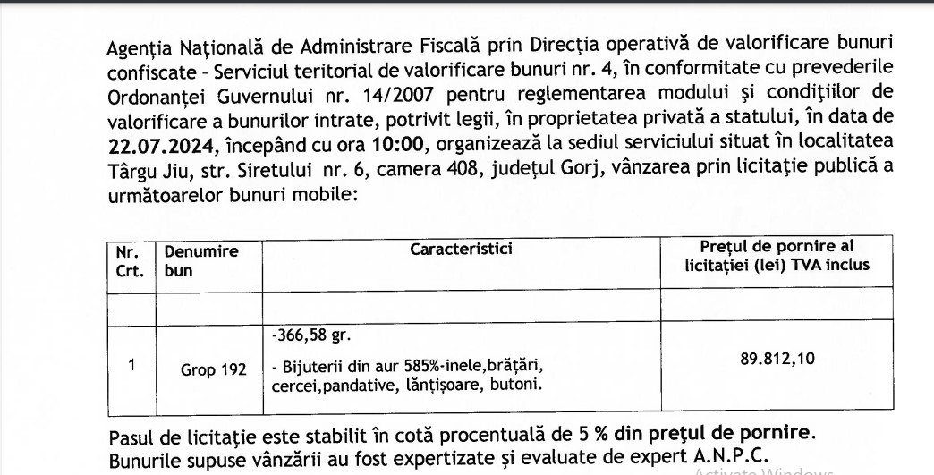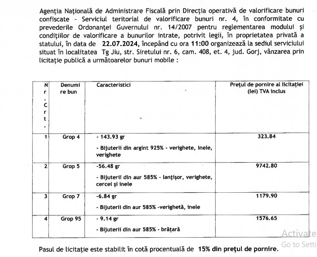 O primă licitație va avea loc începând cu ora 10:00, la sediul Serviciului teritorial de valorificare bunuri nr. 4 din Târgu Jiu. Este vorba de un grup de bijuterii din aur, de 366,58 grame, respectiv inele, brățări, cercei, pandantive, lănțișoare și butoni. Prețul de pornire a licitației este de 89.812,10 lei, cu TVA inclus.