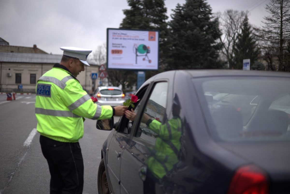 Șoferițele din Târgu Jiu au fost „amendate” cu flori de către polițiștii locali.