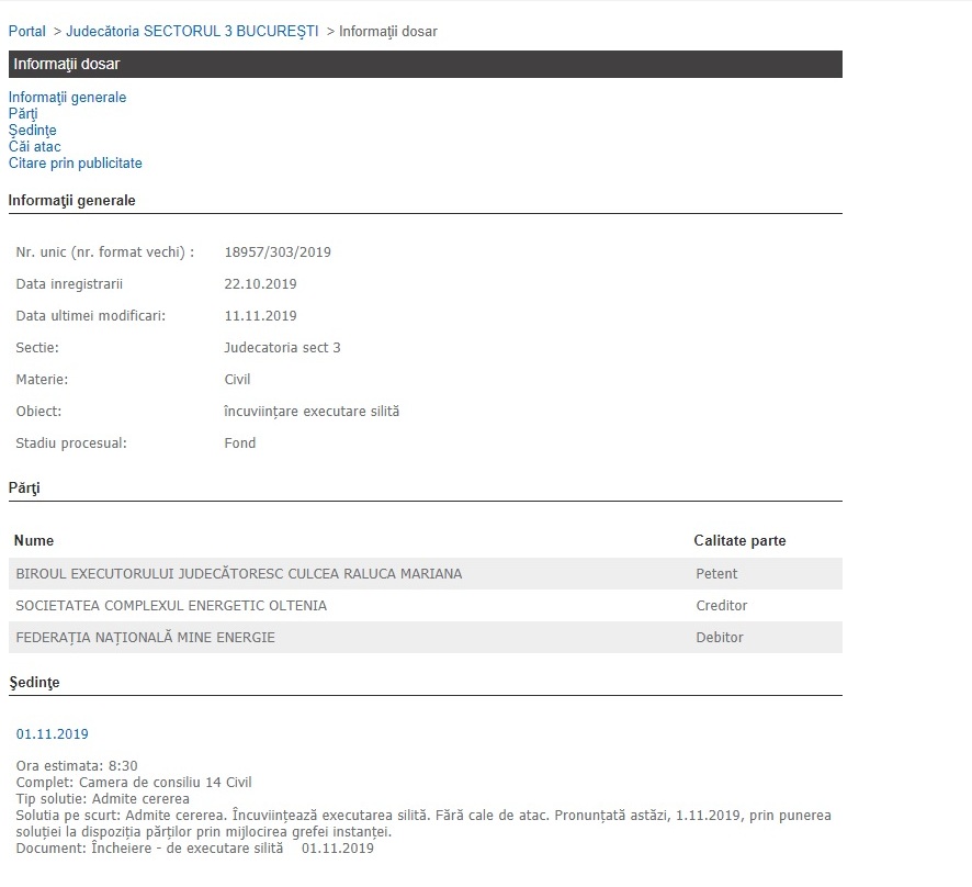 Federația Națională Mine Energie, aflată în plin proces electoral de alegere a unei noi conduceri prin votul membrilor, a pierdut în luna iunie un proces cu Complexul Energetic Oltenia, compania solicitând FNME plata cotei parte din cheltuieli pentru menținerea în siguranță a Hotelului Mina pentru anii 2016-2017. Banii nu au fost primiți încă de CEO, motiv pentru care societatea a apelat la executarea silită a FNME. O instanță a Judecătoriei Sectorului 3 București a aprobat această solicitare chiar luna trecută, motiv pentru care FNME este executată silit din luna noiembrie a acestui an, pentru recuperarea unei sume de aproape 5100 de lei.