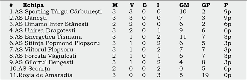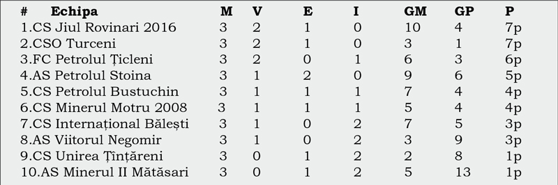 Deşi nicio formaţie nu are punctaj maxim în Liga 4, două echipe conduc plutonul la judeţ. Este vorba despre CS Jiul Rovinari 2016 şi CSO Turceni. Ambele au acumulat 7 puncte, după noi succese în runda cu numărul trei. Victoria Jiului a venit după meciul cu cele mai multe goluri din această etapă a Ligii a patra. La ,,Onoare”, două echipe au trei victorii din trei runde. Este forma despre Târgu Cărbunești și Dănești.