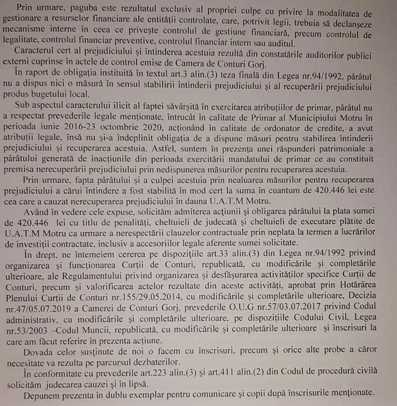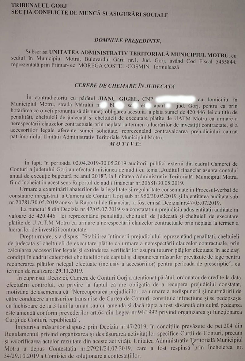 Fostul edil liberal al municipiului Motru, Gigel Jianu, a fost dat în judecată de UAT-ul pe care l-a condus până la finalul lunii septembrie pentru recuperarea unei sume de 420.446 de lei cu titlu de penalități, la care se adaugă cheltuieli de judecată și cheltuieli de executare, ce au fost plătite de unitatea administrativ teritorială municipală. Totul, ca urmare a nerespectării clauzelor contractuale prin neplata la termen a lucrărilor de investiții contractate și a accesoriilor legale aferente sumei solicitate. Practic, suma pe care o cere primăria fostului edil s-a constituit drept prejudiciu, lucru constatat de auditorii Camerei de Conturi Gorj.
