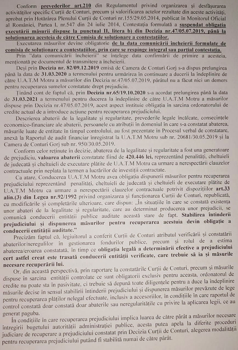 De altfel, raportul de audit financiar nr.20681 a fost urmat pe 5 iulie 2019 de Decizia nr.47 care stabilea că s-a adus un prejudiciu primăriei în valoare de peste 420.000 de lei reprezentând penalități, cheltuieli de judecată și executare care au fost plătite de UAT ca urmare a nerespectării clauzelor contractuale prin neplata la termen a lucrărilor de investiții contractate.