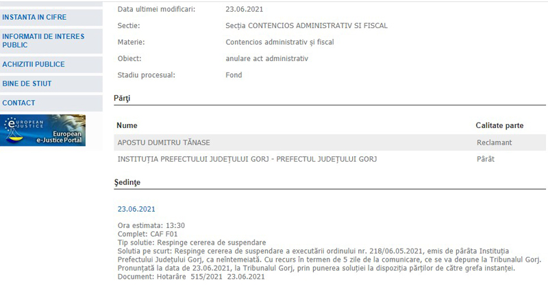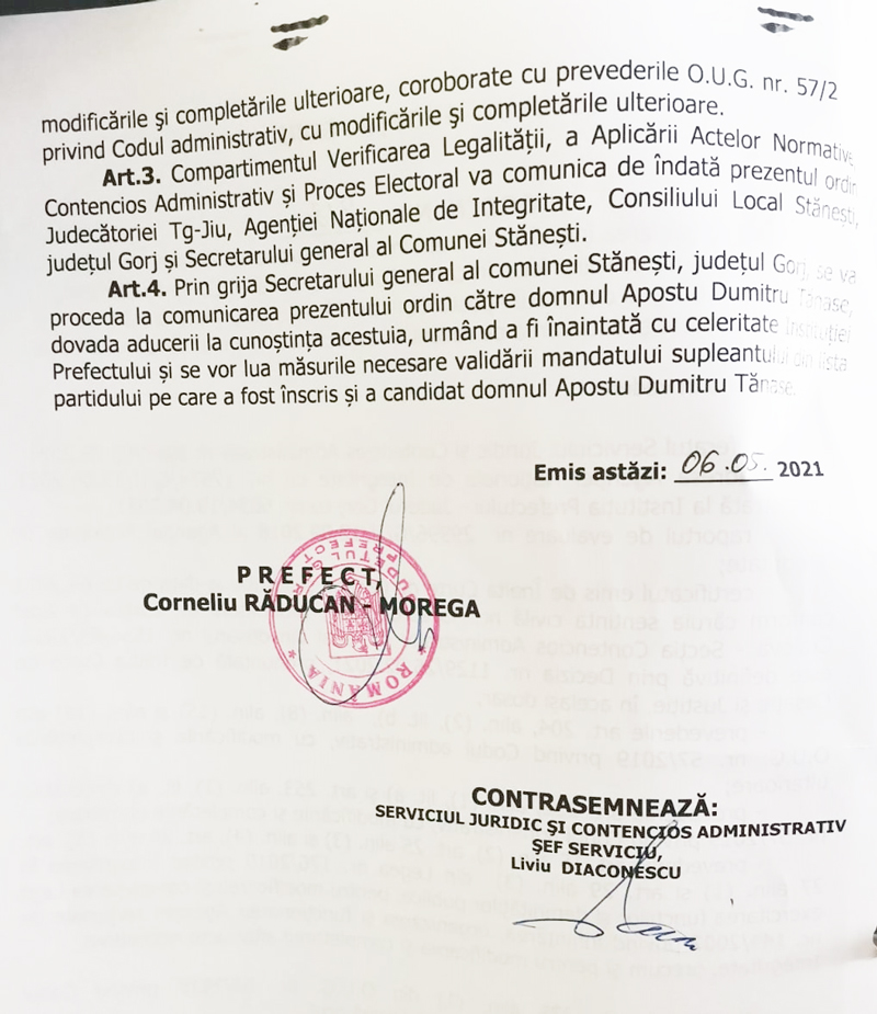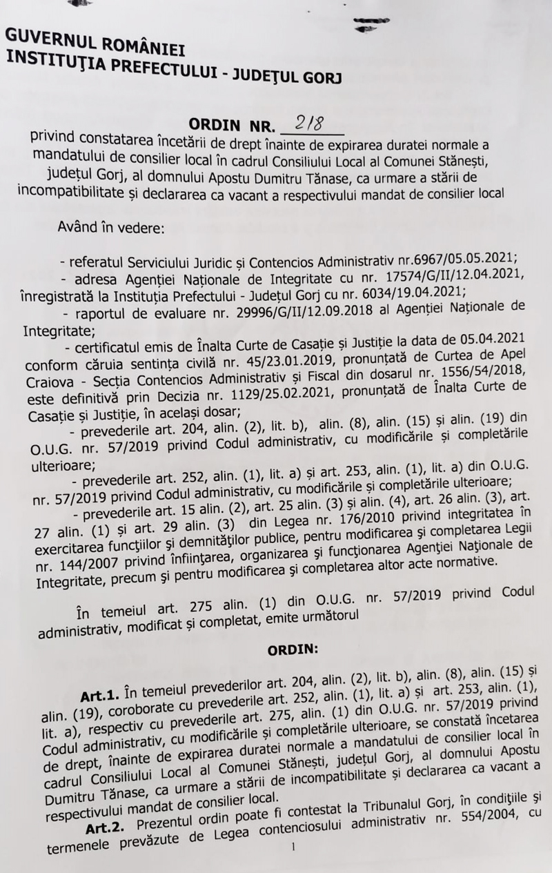 Și acest act administrativ a fost atacat în instanță, Apostu solicitând anularea ordinului. „Respinge cererea de suspendare a executării ordinului nr. 218/06.05.2021, emis de pârâta Instituţia Prefectului Judeţului Gorj, ca neîntemeiată. Cu recurs în termen de 5 zile de la comunicare, ce se va depune la Tribunalul Gorj. Pronunţată la data de 23.06.2021, la Tribunalul Gorj, prin punerea soluţiei la dispoziţia părţilor de către grefa instanţei”, se arată în decizia de miercuri a instanței. Declarat incompatibil, Apostu a fost înlocuit pe 3 iunie din Consiliul Local Stănești. Locul său a fost luat de Victor Alexandru Hortopan. Și fostul primar Ștefan Blideanu, cu care Apostu a făcut echipă, are probleme cu ANI. La începutul anului, Agenția Națională de Integritate a sesizat Parchetul de pe lângă Judecătoria Târgu-Jiu cu privire la existența indiciilor referitoare la săvârșirea de către fostul primar a infracțiunii de „folosirea funcției pentru favorizarea unor persoane, prevăzută de art. 301, alin. (1) din Codul Penal, întrucât, în calitate de Primar al Comunei Stănești a emis acte administrative, care au produs un folos material pentru soția sa, respectiv, fiul său”.