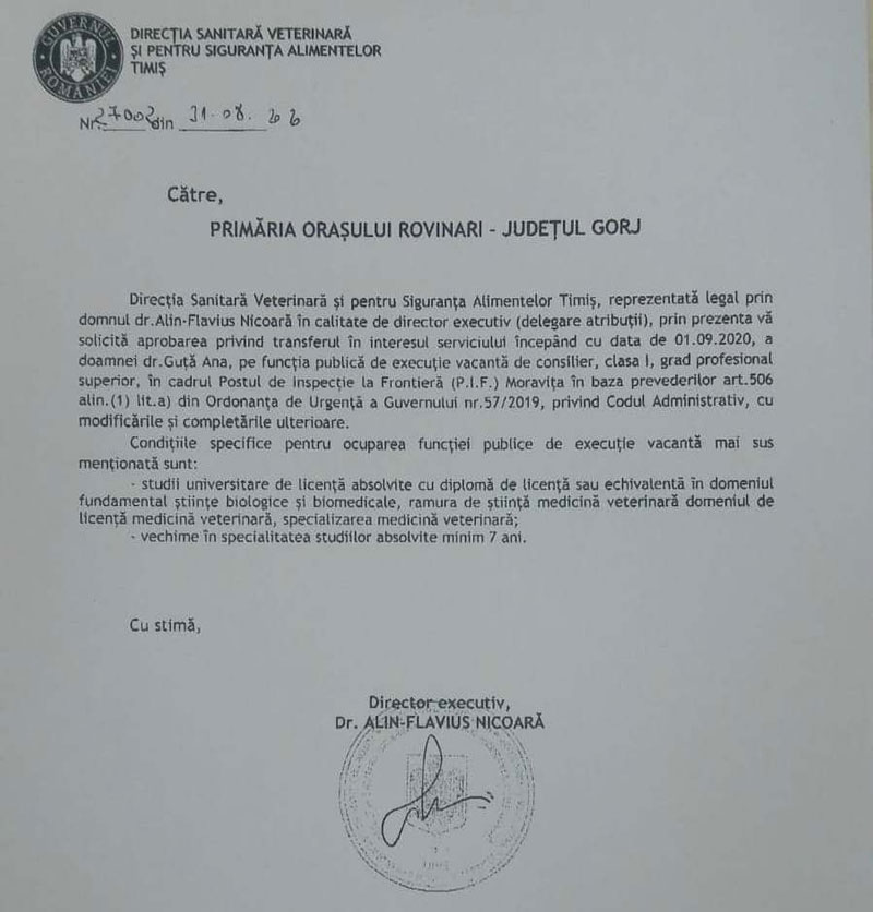 Direcția Sanitar-Veterinară și pentru Siguranța Alimentelor Timiș, reprezentată de directorul executiv Alin Flavius Nicolară, a solicitat pe 31 august Primăriei Rovinari transferul în interesul serviciului a salariatei Ana Guță. Aceasta ocupa postul de șef Serviciu SPAS al Primăriei Rovinari, post ocupat prin concurs din luna martie a acestui an.
