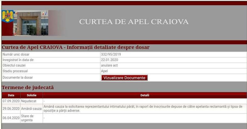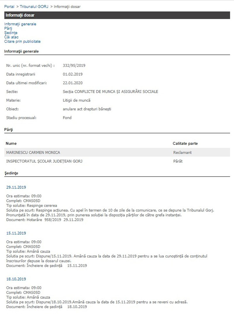 La termenul din 29 iunie, IȘJ Gorj vrea însă doar o amânare, urmare a înscrisurilor depuse de Marinescu la dosar. La amânări repetate a mai apelat instanța de fond și la procesul început anul trecut, când IȘJ Gorj refuza să depună la dosarul cauzei înscrisurile cerute de instanță.