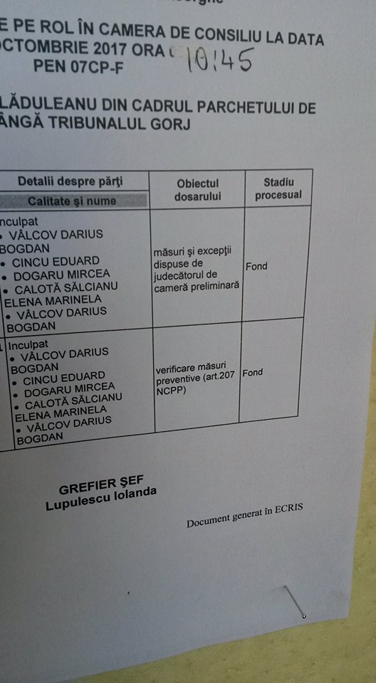 Dosarul a fost trimis la Târgu-Jiu, în urma unei decizii a Curții de Apel Craiova, care, pe 5 octombrie, a dispus strămutarea în acest caz. „Admite cererea. Dispune strămutarea judecării cauzei ce face obiectul dosarului nr. 3263/104/2017 al Tribunalului Olt, la Tribunal Gorj – Secţia penală. Menţine actele îndeplinite de Tribunalul Olt – Secţia penală, până la data de 18.09.2017. Definitivă”, au decis magistrații din Craiova.