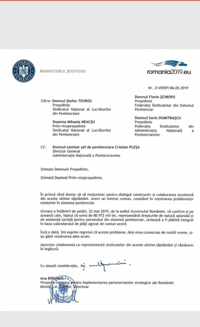 Ministrul interimar al justiției, vicepremierul pentru implementarea parteneriatelor strategice, doamna Ana Birchall, și ministrul finanțelor publice, ministru al fondurilor europene, interimar, domnul Eugen Teodorovici, au avut, miercuri, 22 mai 2019, o întâlnire, la sediul Guvernului României, cu reprezentanții sindicatelor din penitenciare, în cadrul căreia au fost discutate problemele existente, în acest moment, în sistemul penitenciar, semnalate în cadrul discuțiilor purtate, în ultimele săptămâni, cu ministrul justiției, interimar, doamna Ana Birchall, precum și soluțiile propuse. La întâlnire au participat din partea sindicatelor preşedintele Sindicatului Naţional al Lucrătorilor din Penitenciare, Ştefan Teoroc, prim-vicepreședintele Sindicatului Național al Lucrătorilor din Penitenciare, doamna Mihaela Neacșu, președintele Federației Sindicatelor din Sistemul Penitenciar, domnul Florin Șchiopu, precum și președintele Federației Sindicatelor din Administrația Națională a Penitenciarelor, domnul Sorin Dumitrașcu.