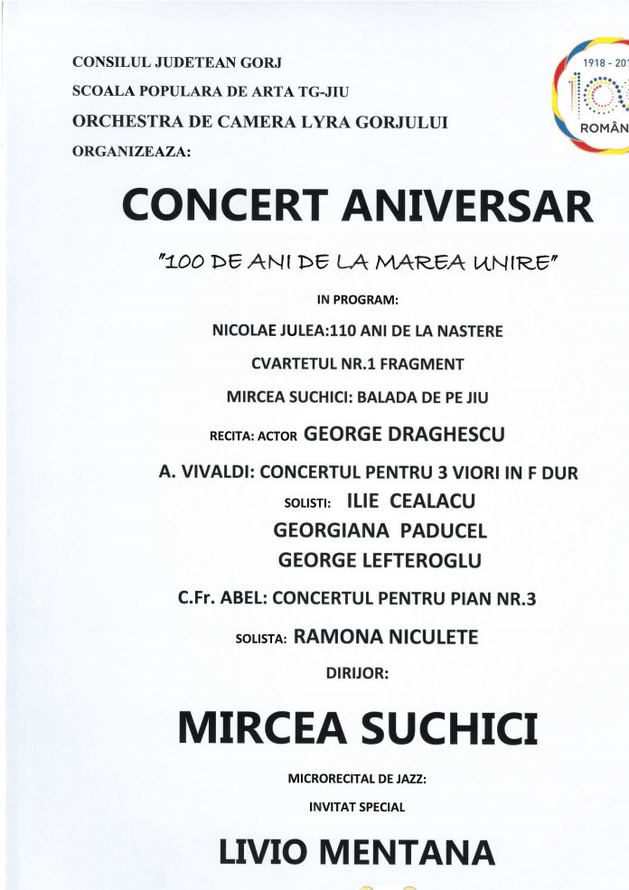 Cu prilejul aniversării Centenarului României, Orchestra de Cameră Lyra Gorjului, a Școlii Populare de Artă Târgu Jiu, vă invită joi, 29 noiembrie 2018, la Teatrul Dramatic „Elvira Godeanu”, începând cu ora 19:00, la un concert special, cu un program care va cuprinde lucrări cunoscute ce se bucură de admiraţia iubitorilor muzicii clasice.
