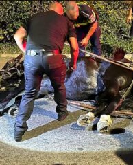 Foto: Cal în agonie, eliberat și salvat, aseară, de polițiști, pe strada Narciselor din Târgu Jiu