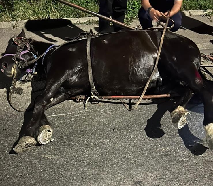 Aseară, polițiști de ordine publică din cadrul Poliției Municipiului Târgu Jiu, în timp ce se aflau în exercitarea atribuțiilor de serviciu, pe strada Narciselor, din localitate, au observat că un cal care era legat la căruță era răsturnat pe carosabil, fiind în stare de agonie.