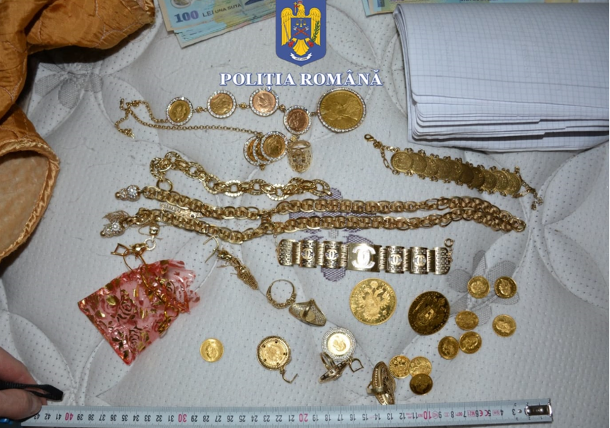 Pentru documentarea activității infracționale, au fost efectuate astăzi, 25 februarie, trei percheziții domiciliare, în municipiul Târgu Jiu, în urma cărora au fost descoperite și indisponibilizate 110 grame de bijuterii din aur, 2.500 de obiecte de îmbrăcăminte/încălțăminte, purtătoare de mărci notorii, 26.906 euro și 70.000 de lei.