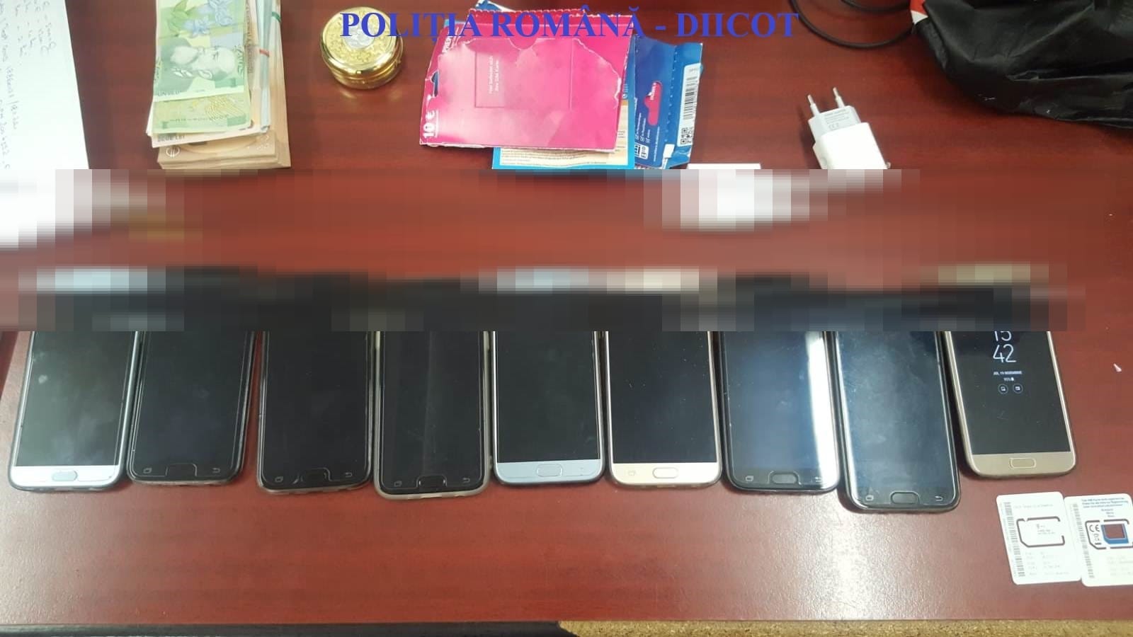 De asemenea, în cursul zilei de ieri, polițiștii de crimă organizată au efectuat trei percheziţii domiciliare, în judeţul Gorj, la locaţiile bărbaților, fiind identificate 12 telefoane mobile, carduri bancare, înscrisuri privind transferuri monetare din străinătate precum şi suma de 6.900 euro.