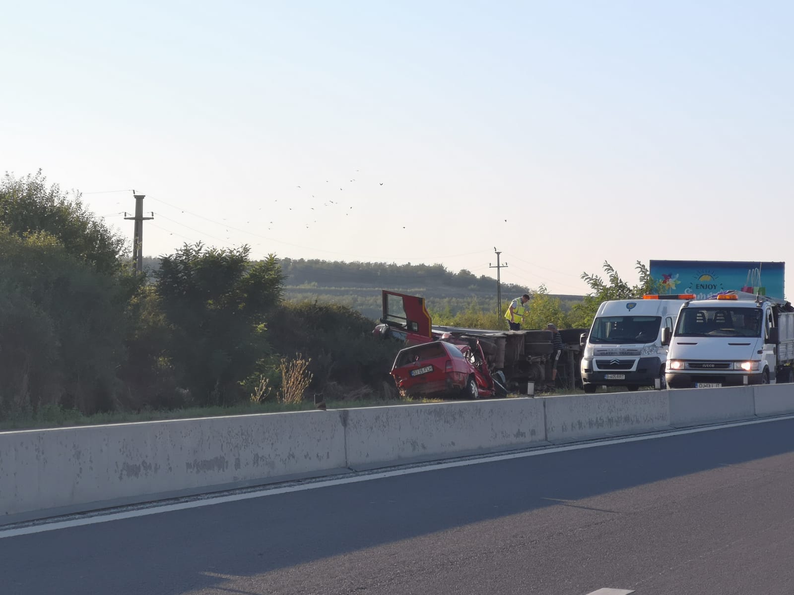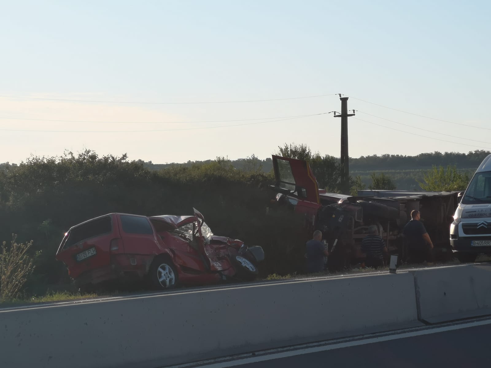 Primul autoturism ar fi fost apoi proiectat pe sensul opus în fața tirului condus de un bărbat de 50 de ani, din Argeş. Acesta a încercat să evite impactul și din acest motiv s-a răsturnat.