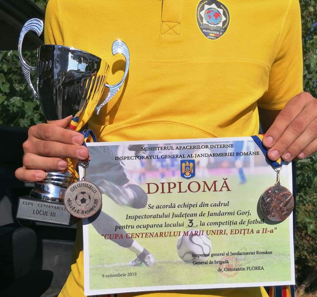 Echipa Jandarmeriei Gorj a participat, de luni până astăzi, la Turneul Final de Minifotbal – Cupa Centenarului Marii Uniri, ediţia a II-a, care s-a desfășurat în București. Angajații IJJ Gorj au urcat pe podium. „În urma desfăşurării competiţiei a reuşit clasarea pe locul III şi obţinerea medaliilor de bronz. Participarea colegilor noştri între cele mai bune echipe ale Jandarmeriei Române din ţară şi locul obţinut, ne onorează şi suntem mândrii de ei. Felicitări campionilor noştri, suntem o echipă!”, au scris reprezentanții IJJ Gorj, pe pagina de Facebook a instituției. Anul trecut, jandarmii gorjeni s-au clasat pe locul șapte.