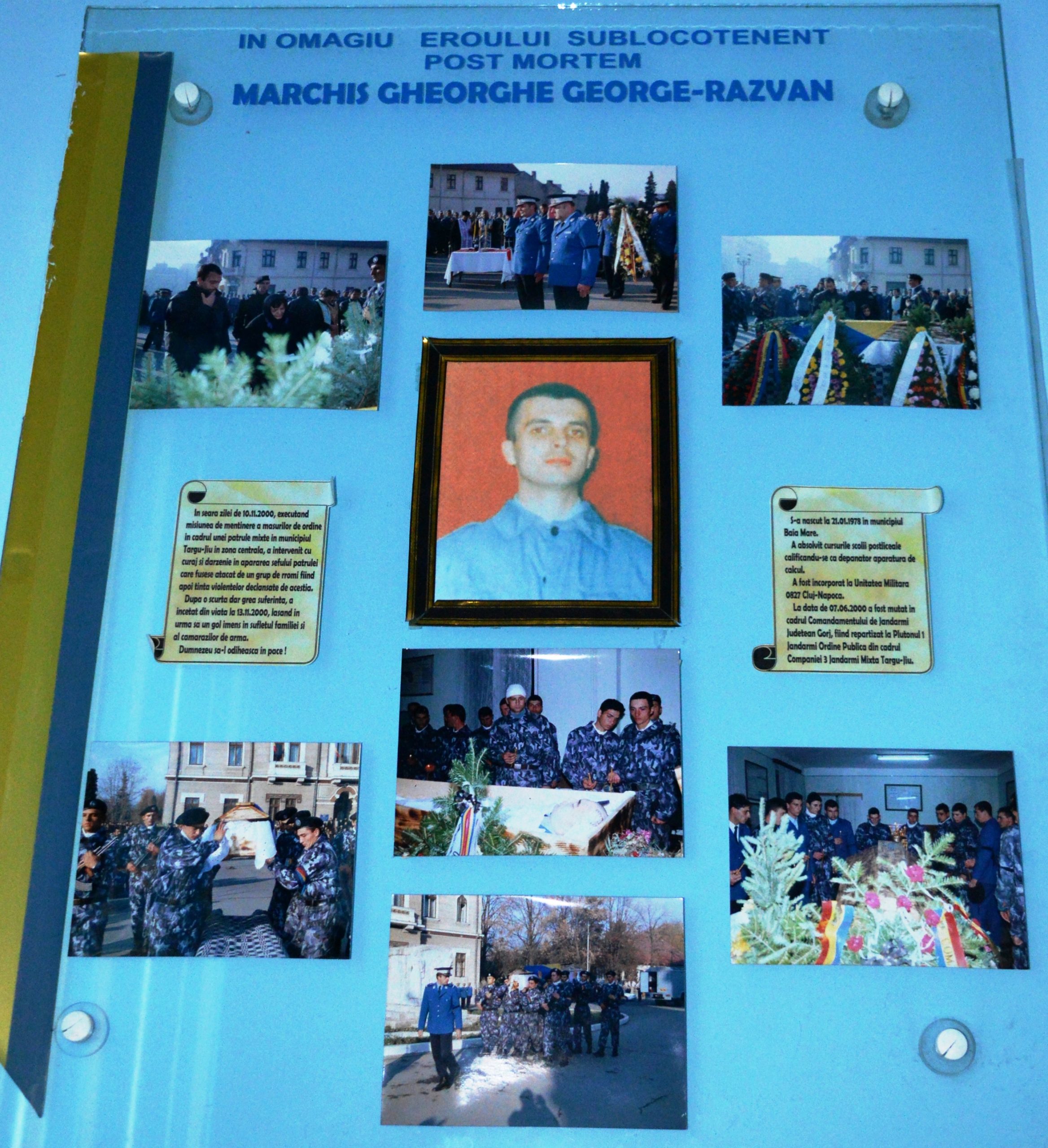 20 de ani au trecut de când eroul jandarm sublocotenent post mortem George Răzvan Marchiş și-a pierdut viaţa pe timpul executării unei intervenţii la o discotecă din municipiul Târgu Jiu.