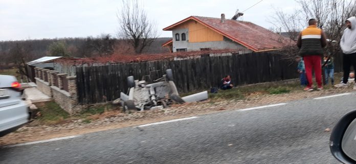 Un autoturism a ajuns în șanț, răsturnat pe plafon, în timp ce un bărbat rănit se afla lângă mașină.