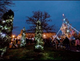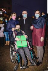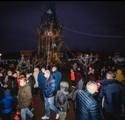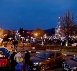 Instalația de pe bradul natural, pregătit de autorități a fost aprinsă, în această seară, de o tânără aflată în cărucior cu rotile.
