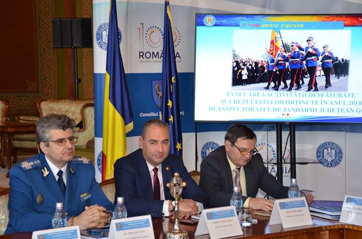 Prefectul Ciprian Florescu și subprefectul județului Gorj, Sorin Arjoca, au participat astăzi la ,,Evaluarea activităţii Inspectoratului de Jandarmi Judeţean ,,Tudor Vladimirescu” în anul 2018.” Activitatea s-a desfășurat în Sala Maură a Palatului Administrativ.