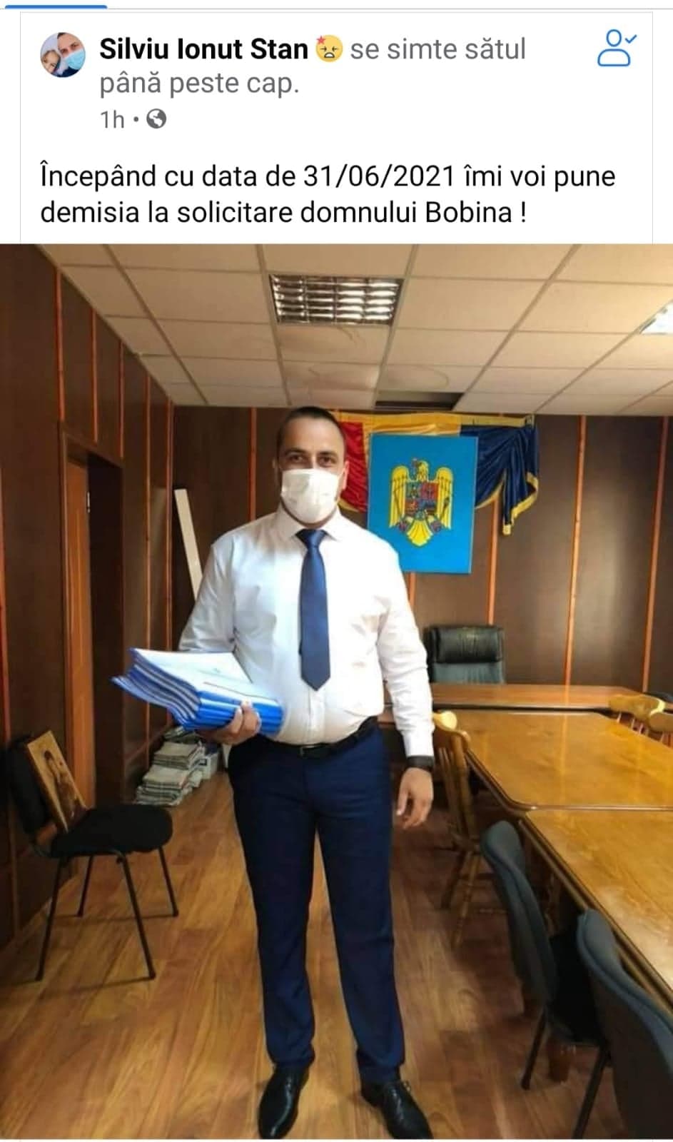 Este vorba despre primarul liberal al comunei Albeni, Silviu Ionuţ Stan, care a anunţat,sec, pe Facebook, că demisionează, stabilind că este “sătul până peste cap”. Data demisiei şi-a ales-o pe 31 06 2021, luna iunie având 30 de zile.