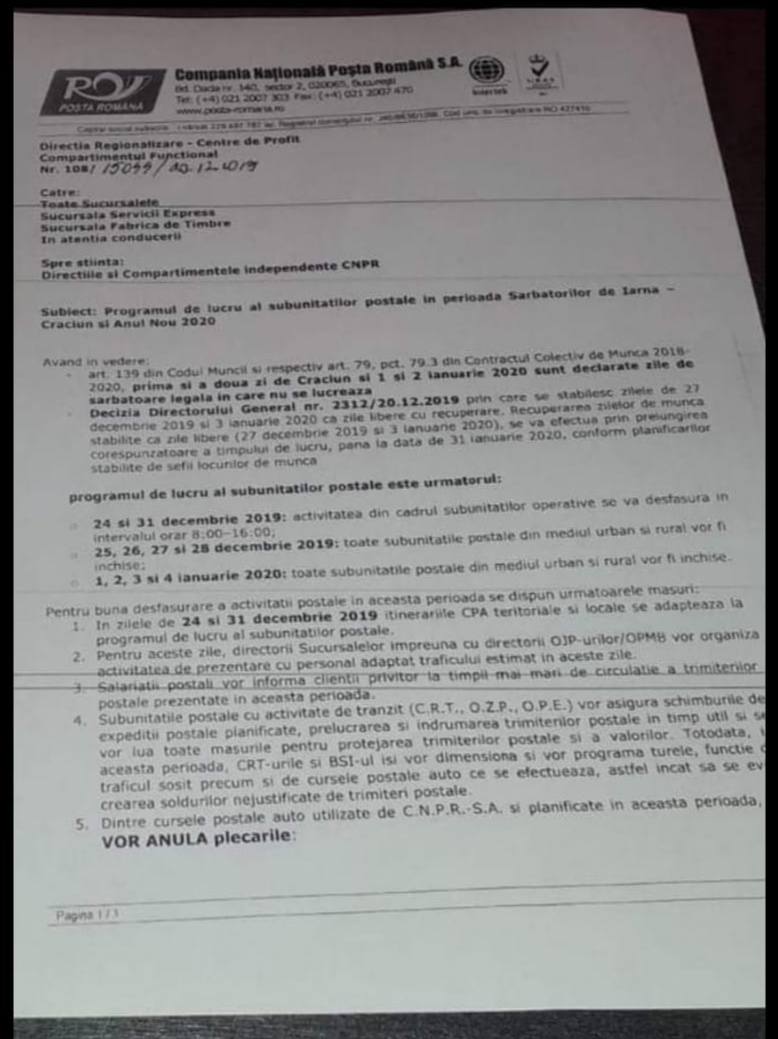 Poștă Română a făcut public programul de lucru al subunităților poștale cu ocazia Sărbătorilor de iarnă. Astfel în zilele de 24 și 31 decembrie 2019 se va lucra între orele 08:00-16:00, iar zilele nelucrătoare vor fi 25, 26, 27, 28 și 29 decembrie, precum și 1, 2, 3, 4 și 5 ianuarie 2020.