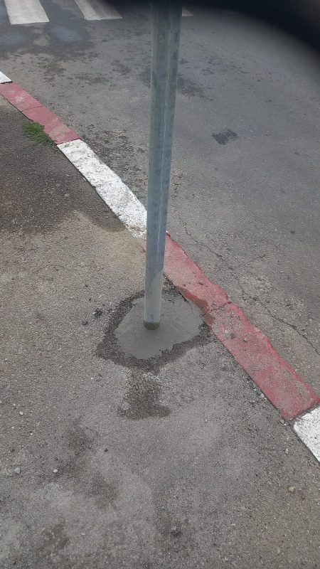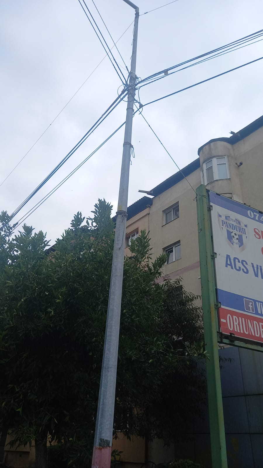 Un stâlp de iluminat se ține doar în cablurile de telecomunicații, după ce azi-noapte a fost rupt de un un BMV care a intrat și peste semnul de circulație. Cert este că semnul de circulație a fost ”plantat” în ciment de curând.