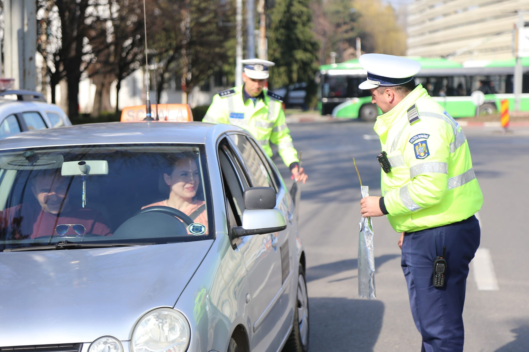 Șoferițele au fost oprite în trafic astăzi, 8 Martie, la Târgu Jiu. Nu pentru a fi sancționate, ci pentru a primi flori din partea polițiștilor de la Rutieră.