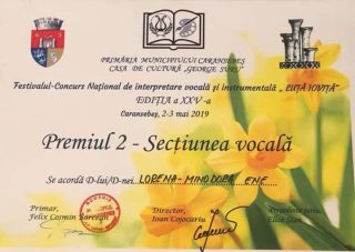 Lorena Ene, cursantă a Școlii Populare de Artă Târgu Jiu, coordonată de prof. Maria Loga, a obținut Premiul II în cadrul Festivalului – Concurs Internaţional „Luţă Ioviţă”, ediția a XXV-a, organizat de Primăria Caransebeș și Casa de Cultură “George Suru”, în perioada 2-3 mai.