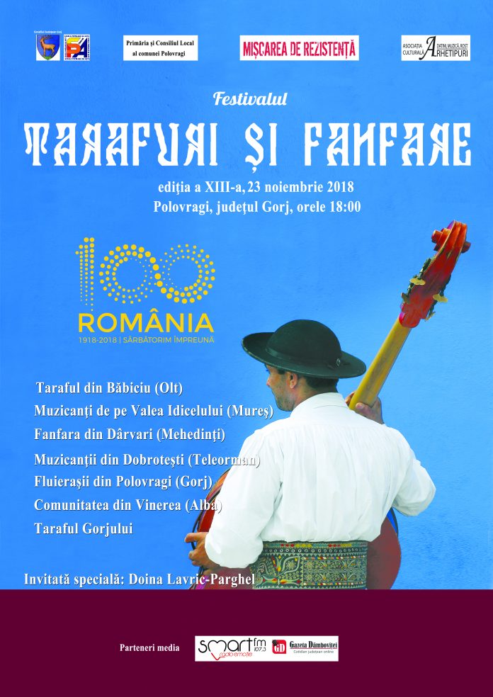 Şcoala Populară de Artă din Târgu Jiu, alături de Consiliul Județean Gorj, Primăria şi Consiliul Local Polovragi, Asociaţia Culturală „Arhetipuri: Datini, Muzică, Rost” şi Asociaţia Mişcarea de Rezistenţă organizează vineri, 23 noiembrie 2018, începând cu ora 18:00, la Polovragi, Festivalul Tarafuri şi Fanfare, ediţia a XIII-a.
