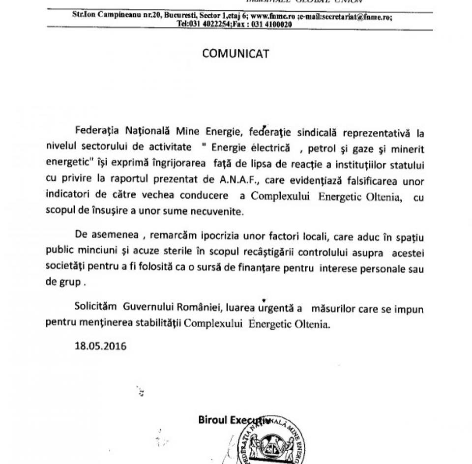 Federația Națională Mine Energie solicită cercetarea, de către organele abilitate, falsificarea indicatorilor de performanță la CE Oltenia prin care directorii și supraveghetorii au luat în plus peste 300.000 de lei.