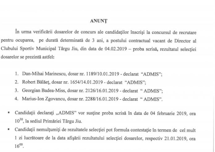 Dosarele a 4 candidați au fost selectate și admise în cadrul concursului organizat de Primăria Târgu Jiu pentru ocuparea postului de director al Clubului Sportiv Municipal. Numele celor 4 doritori se pot vedea în fotografia alăturată. Aceștia vor susține pe data de 4 februarie proba scrisă.