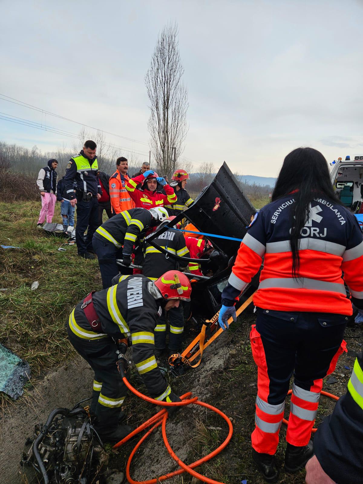 ”La fața locului s-au deplasat două autospeciale pentru descarcerare și o ambulanță SMURD din cadrul ISU Gorj, precum și o ambulanță din cadrul Serviciului Județean de Ambulanță Gorj, echipajele de intervenție constatând că în urmă impactului o persoană de sex masculin în vârstă de 50 de ani care se află în autoturism a rămas încarcerată.