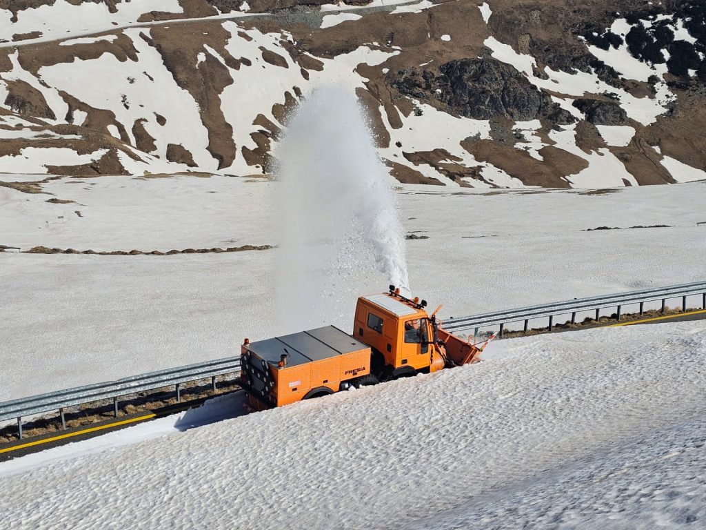 Utilajele de deszăpezire pe Transalpina acționează și astăzipentru îndepărtarea zăpezii de pe partea carosabilă, până în zonele cunoscute ca fiind mai problematice.