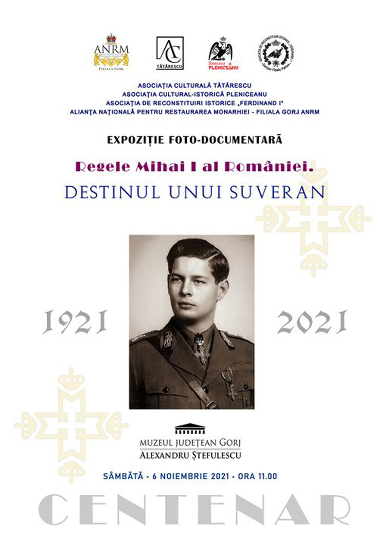 Expoziția este organizată de Asociația culturală Tătărescu, Asociația cultural-istorică Pleniceanu, Asociația de Reconstituiri Istorice „Ferdinand I” și Alianța Națională pentru Restaurarea Monarhiei – Filiala Gorj ANRM, cu ocazia aniversării Centenarului nașterii Regelui Mihai I al României. „Asociația culturală Tătărescu, Asociația cultural-istorică Pleniceanu, Asociația de Reconstituiri Istorice „Ferdinand I” și Alianța Națională pentru Restaurarea Monarhiei – Filiala Gorj ANRM, organizează la Muzeul Județean Gorj „Alexandru Ștefulescu”, în data de 6 noiembrie 2021, cu ocazia aniversării Centenarului nașterii Regelui Mihai I al României, deschiderea Expoziției foto-documentare „Regele Mihai I al României. Destinul unui suveran”. Expoziția cuprinde fotografii provenind din colecții particulare, Arhiva Națională a României și presa vremii, care îl înfățișează pe regele Mihai I de-a lungul timpului, o uniformă de aviație, din timpul celui de-al Doilea Război Mondial, cu însemnele gradului de Mareșal, demnitate deținută de Regele Mihai I, dar și fotografii din anul 1938, când Mihai I, pe atunci Mare Voievod de Alba Iulia, a vizitat Gorjul alături de profesorii și colegii săi de clasă. Prin organizarea acestei expoziții foto-documentare, Târgu-Jiul se alătură municipiilor și orașelor care au organizat în acest an evenimente omagiale dedicate celebrării celor 100 de ani de la nașterea regelui Mihai I al României”, au transmis organizatorii, prin intermediul unui comunicat.