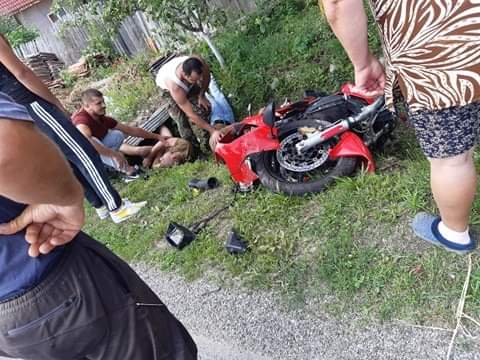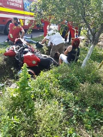 Cei doi prieteni, unul conducător al motocicletei iar celălalt pasager, au ajuns într-un șanț de pe marginea drumului, după ce conducătorul a intrat cu vehiculul într-un cap de pod.