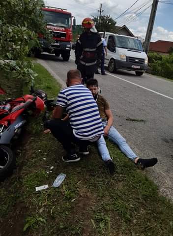 Cei doi prieteni, unul conducător al motocicletei iar celălalt pasager, au ajuns într-un șanț de pe marginea drumului, după ce conducătorul a intrat cu vehiculul într-un cap de pod.