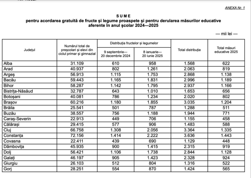 Peste 28.000 de preşcolari şi elevi din învăţământul primar şi gimnazial din Gorj ar urma să beneficieze, încă din prima săptămână de școală, de lapte, fructe și cornuri, însă deocamdată nu a demarat nicio procedură pentru achiziții. Copiii ar trebui să primească, în decurs de o săptămână, două porţii de fructe şi/sau legume, trei porţii de lapte, două porţii de produse lactate şi cinci porţii de produse de panificaţie, prin Programul pentru şcoli al României, susţinut în mare parte cu bani europeni. Concret, în cazul fructelor și legumelor, se pot distribui mere, pere, struguri de masă, prune, morcovi, țelină, sfeclă, ardei grași și castraveți proaspeți. În cazul produselor lactate, se pot distribui: iaurt, lapte acru, lapte covăsit, chefir, sana și „alte sortimente de lapte fermentate sau acrite”.