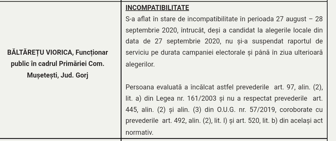 Potrivit unui comunicat al ANI, Viorica Băltărețu, s-a aflat în stare de incompatibilitate în perioada 27 august – 28 septembrie 2020, întrucât, deși a candidat la alegerile locale din data de 27 septembrie 2020, nu și-a suspendat raportul de serviciu pe durata campaniei electorale și până în ziua ulterioară alegerilor.