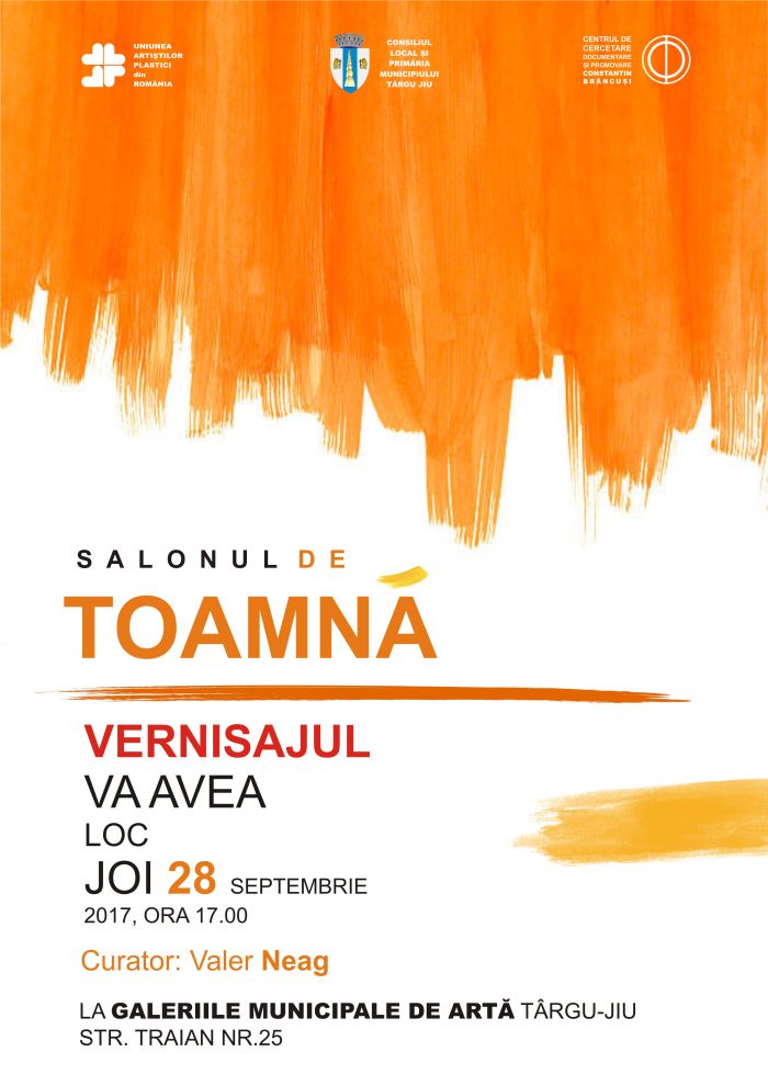 Filiala Târgu-Jiu a UAP din România, în colaborare cu Primăria Municipiului Târgu-Jiu și Centrul de Cercetare Documentare și Promovare „Constantin Brâncuși”, organizează vernisajul Expoziție de Arte Vizuale „SALONUL DE TOAMNĂ”, al membrilor Filialei Târgu Jiu a UAP din România. Evenimentul se desfășoară joi, 28 septembrie 2017, ora 17.00, la Galeriile Municipale de Artă din Târgu-Jiu, Strada Traian.