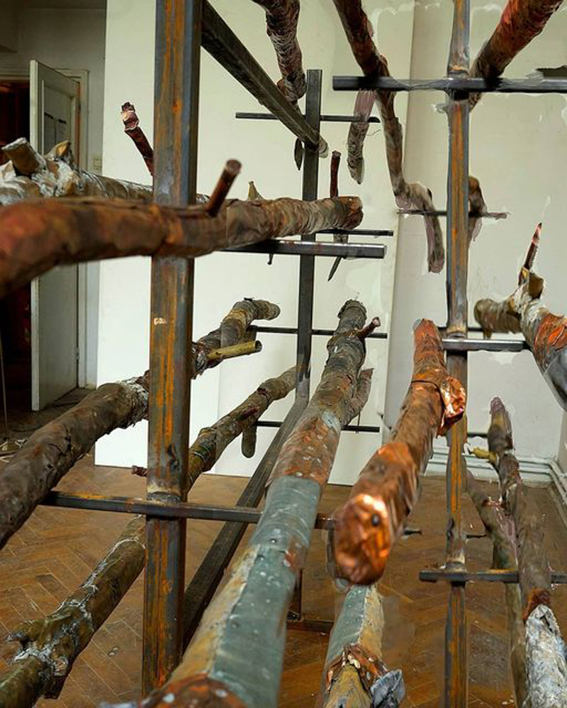„Şi fără să fi văzut vreodată Arta povera, vroiam să mă leg de nişte copaci… îi construiam efectiv, cu structură, aproape ca un semn grafic. Mult mai târziu, cu ocazia bursei de la Cité, fiindcă atelierul meu nu era propice pentru sculptură, că era micuţ şi la etajul 3 – acolo sunt vreo 300 de ateliere şi România îl avea pe acesta –, mi-am propus să fac desene şi reamintindu-mi de tema mea cu copacul am tot desenat… încă mai am caietele de atunci. Culmea este că eu, propunându-mi asta, n-am ştiut că atunci în Paris chiar era o temă care îl omagia pe André Le Nôtre, un grădinar genial care a făcut grădinile de la Versailles. Sărbătoreau 400 de ani de la naşterea lui şi la Versailles era o mare expoziţie de-a lui Giuseppe Penone, care e un mare sculptor din Torino ce lucrează în Arta povera şi face lucrări legate de copac. Tot Parisul era de fapt plin de expoziţii pe tema asta fiindcă şi galeriile particulare se lipesc la proiectul cultural al oraşului şi creează, aşa, o varietate ce pare infinită a unei teme când o vezi făcută de foarte mulţi artişti din multe părţi ale lumii.
