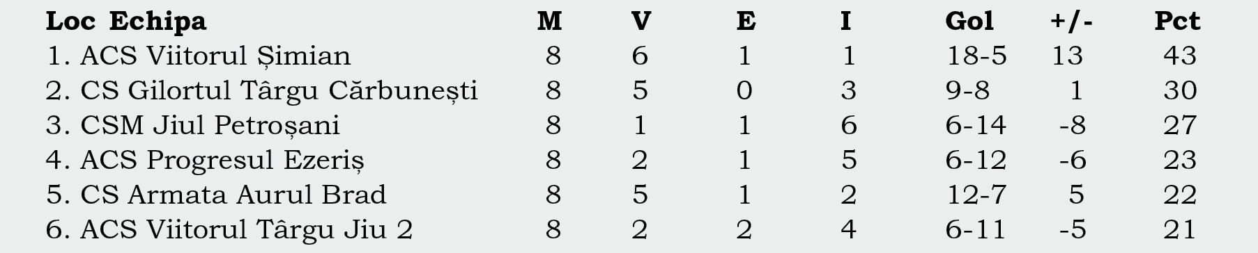 Succes important pentru Gilortul Târgu Cărbuneşti în runda a opta a play-out-ului din Seria 7. Trupa pregătită de Alex Stoica s-a impus cu 2-0 împotriva Viitorului 2, într-un meci jucat vineri, pe Stadionul ,,Aurel Țicleanu” din Bumbeşti Jiu. Victoria a consemnat rămânerea oaspeţilor în eşalonul terţ. Cu toate că s-a bazat şi pe un important contingent de la echipa mare, formaţia gazdă nu a reuşit să înscrie, ba chiar a încasat ambele goluri pâna în pauză. Alex Avrămescu a punctat din penalty în minutul 30, iar Denis Bucur a marcat după o acţiune personală înainte de fluierul care trimitea jucătorii la cabine. Ratările mari au aparţinut tot vizitatorilor şi în mitanul secund, dar Ciutică, Avrămescu sau Almăjanu nu au mai găsit drumul spre gol. Echipa din Târgu Cărbuneşti a răzbunat astfel eşecul din ultima întâlnire directă, disputată pe Stadionul ,,Cristinel Răducan” şi a băgat-o pe Viitorul 2 în probleme mari. Cu două runde înainte de final, echipa lui Costel Andriucă este pe ultimul loc. Totuşi, gorjenii mai au şanse de salvare dacă obţin succese în ambele confruntări.