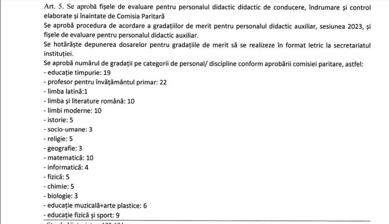 Consiliul de Administrație al Inspectoratului Școlar Județean Gorj a aprobat, în ultima ședință, numărul de gradații de merit, sesiunea 2023, pe categorii de personal și discipline. Sunt scoase la concurs 151 de gradații pentru personalul didactic de predare, conducere, îndrumare și control, plus alte zece gradații pentru personalul didactic auxiliar.