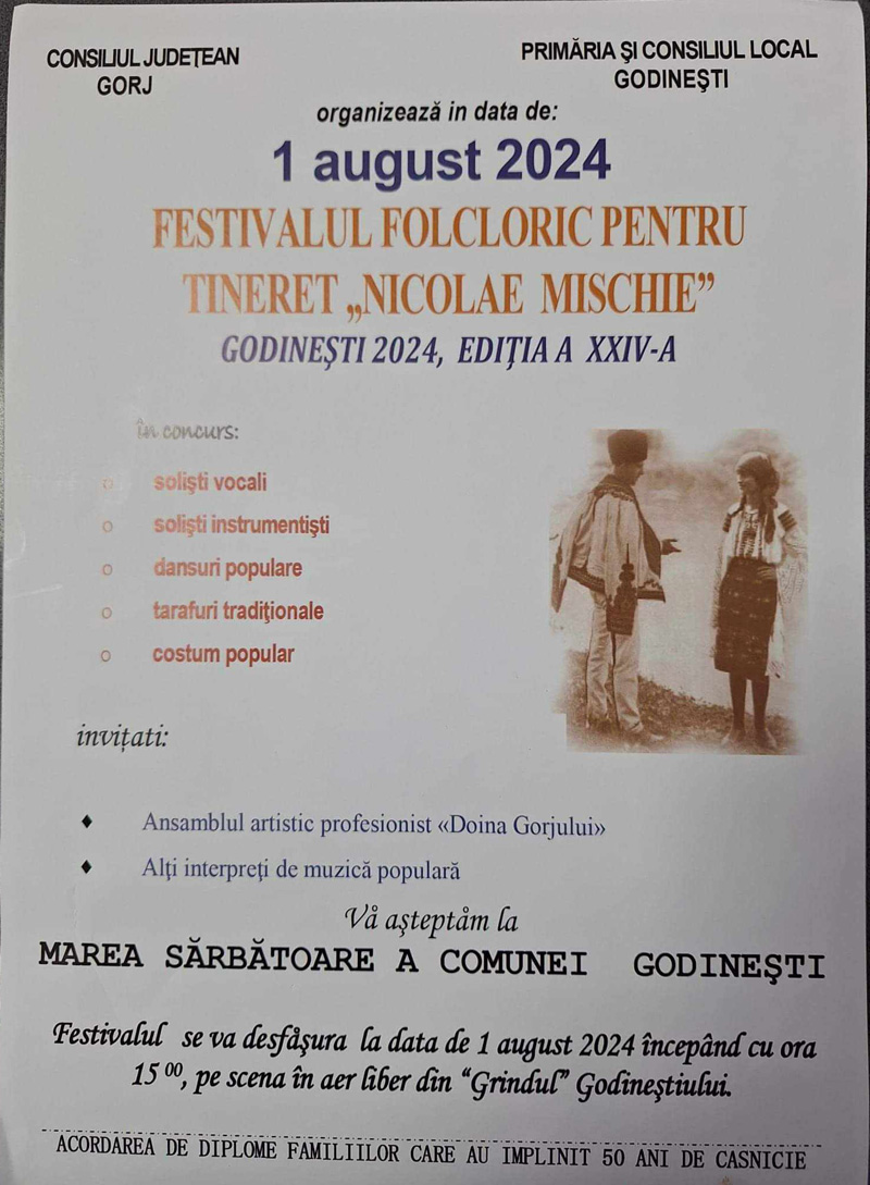 Consiliul Județean Gorj, Centrul Județean pentru Conservarea și Promovarea Culturii Tradiționale Gorj, Primăria și Consiliul Local Godinești și Ansamblul Artistic Profesionist „Doina Gorjului” organizează pe 1 august 2024, o nouă ediție a Festivalului Folcloric pentru Tineret, ediția a XXIV-a, la Godinești.
