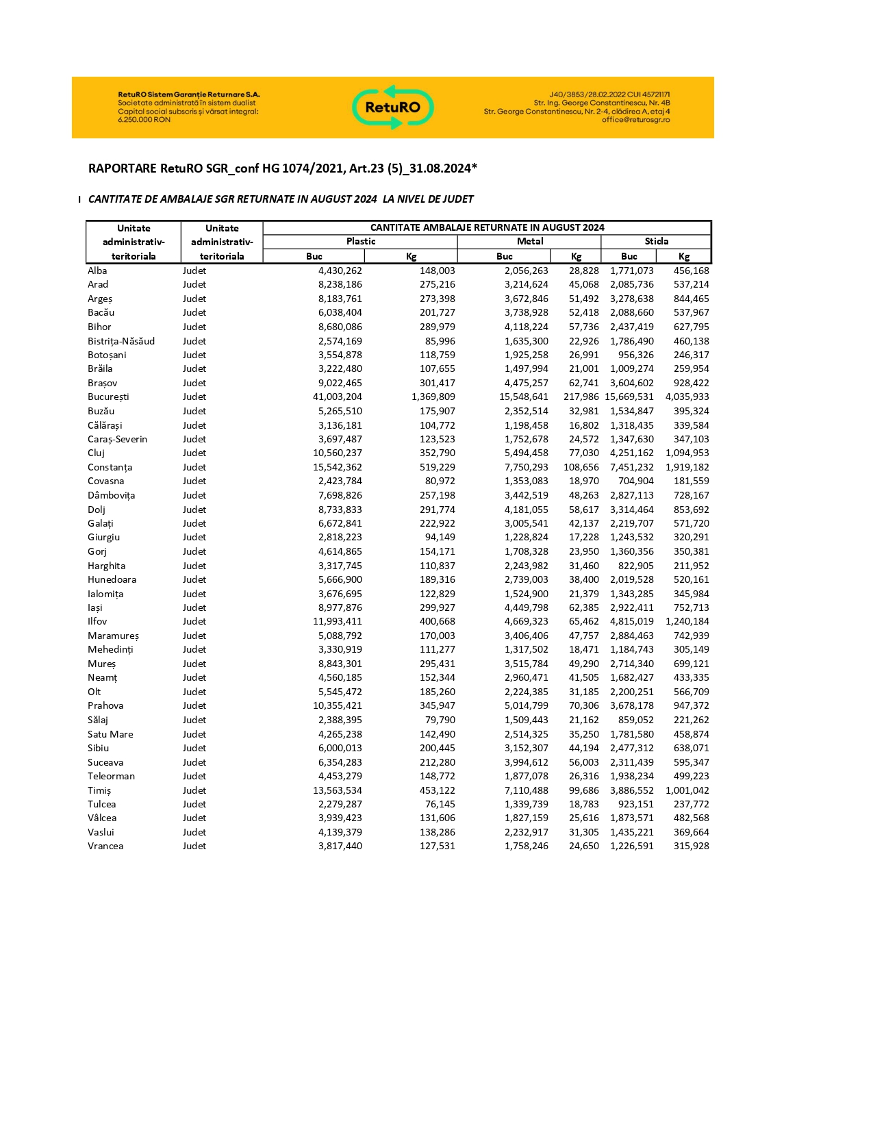 Doar în luna august, 533 de milioane de ambalaje au fost returnate, cu 12,7% mai mult decât în iulie. În august au fost puse pe piață nu mai puțin de 682 de milioane de ambalaje, astfel că rata de colectare a fost de 78%.