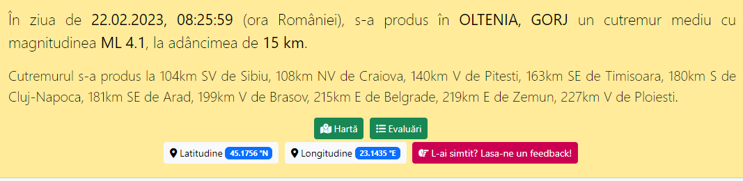 În ziua de 22.02.2023, 08:25:59 (ora României), s-a produs în OLTENIA, GORJ un cutremur mediu cu magnitudinea ML 4.1, la adâncimea de 15 km.