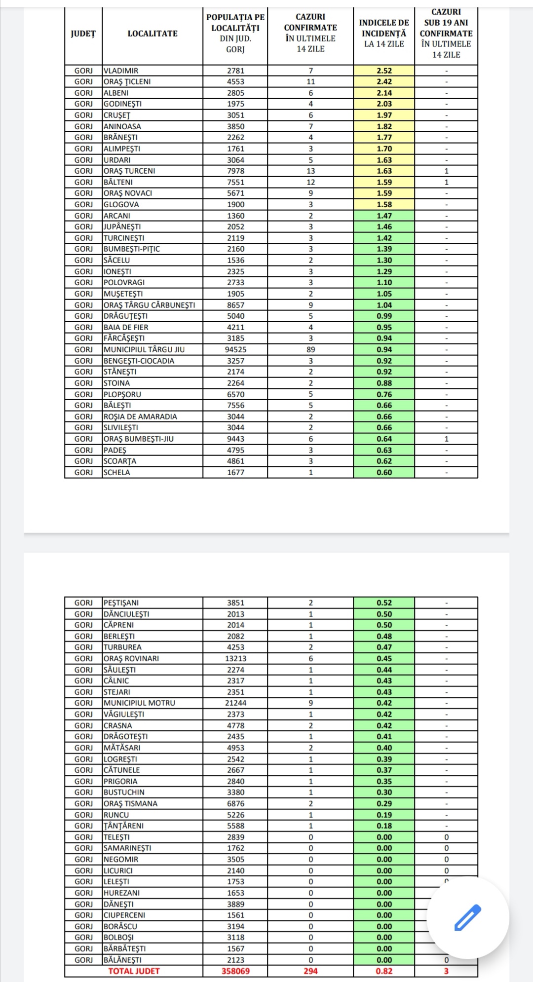 Gorj: Incidența cazurilor de COVID-19, pe localități