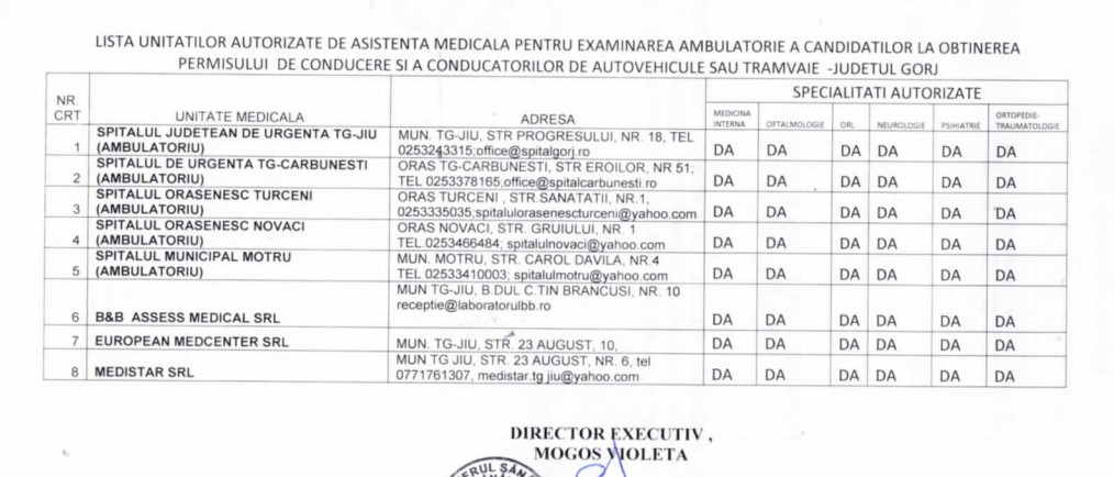 Alte trei unități medicale private din Târgu-Jiu sunt avizate să elibereze fișa medicală ce va fi atașată la dosarul pentru obținerea permisului auto. Este vorba de B&B ASSESS MEDICAL SRL, EUROPEAN MEDCENTER SRL și MEDISTAR SRL.